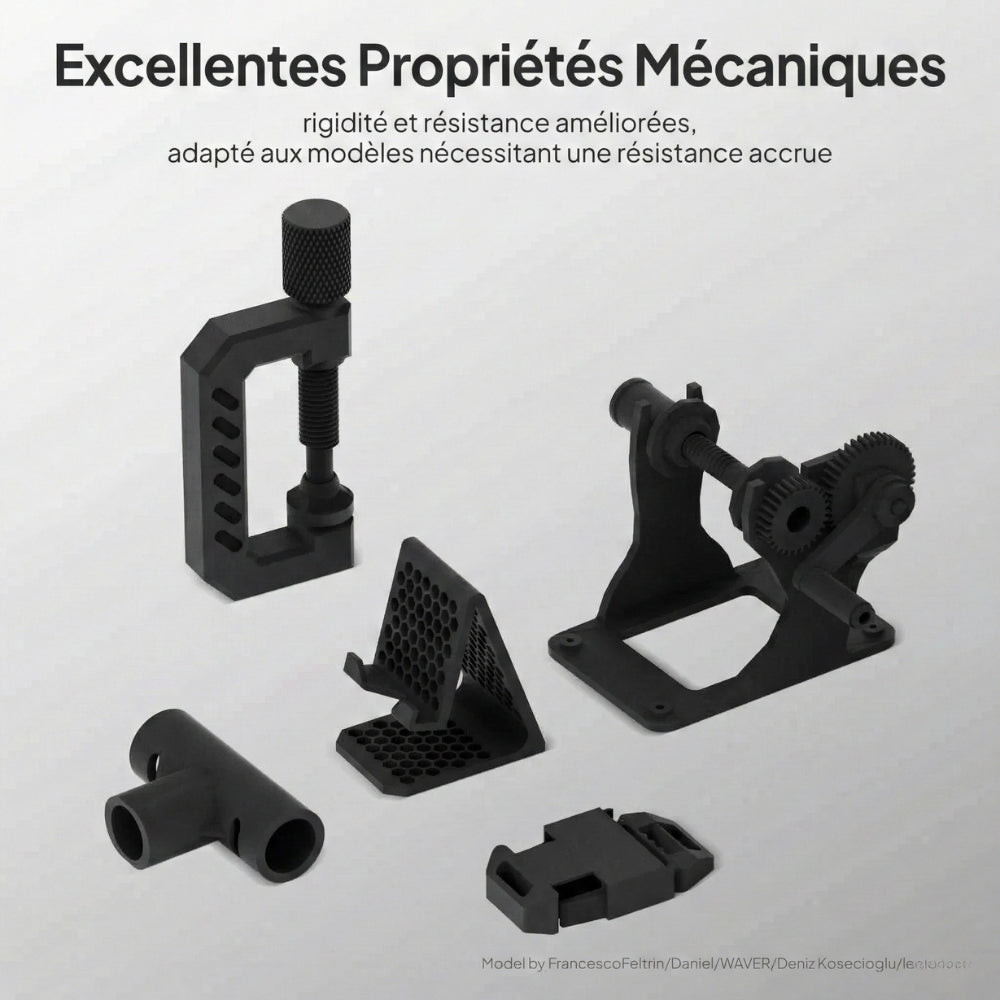 Renforcé par des fibres de carbone, le PLA-CF d'Elegoo offre une résistance et une rigidité supérieures, ce qui le rend parfaitement adapté aux applications structurelles et techniques nécessitant la gestion de charges plus lourdes. Sa conception durable mais légère en fait le choix idéal pour les projets exigeant le meilleur rapport résistance/poids.