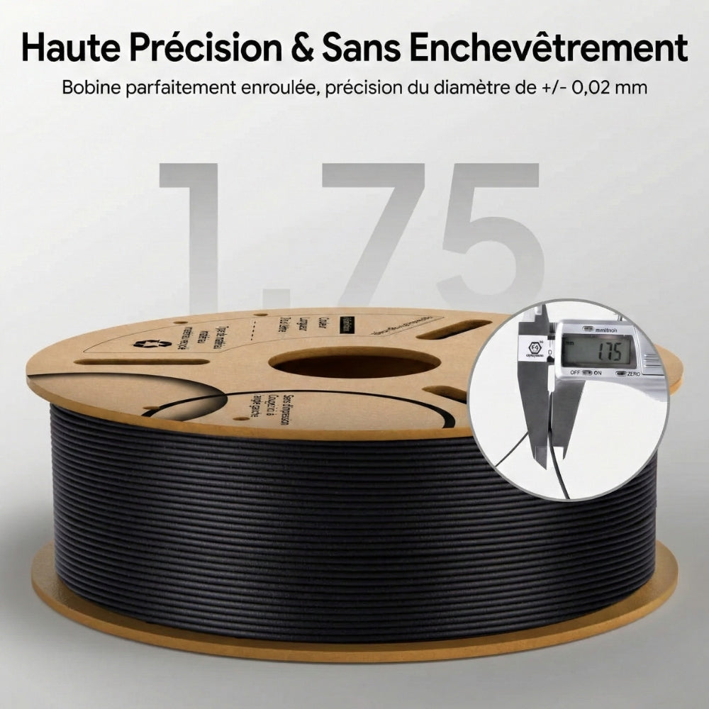 L'ajout de fibres de carbone minimise le gauchissement et le rétrécissement, offrant une précision dimensionnelle et une stabilité supérieures. Conçu pour des assemblages de haute précision, le PLA-CF d'Elegoo garantit des formes constantes et des ajustements précis, en faisant le filament de choix pour les projets où chaque millimètre compte.